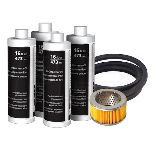 - Includes (4) 16 oz. Compressor Oil, Air Filter and Replacement Belt