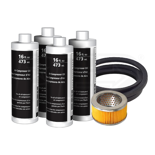 - Includes (4) 16 oz. Compressor Oil, Air Filter and Replacement Belt